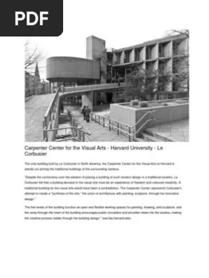 The carpenter center for the visual arts at harvard university, in cambridge, massachusetts is the only building actually designed by le corbusier in the united states, and one of only two in the americas (the other is the curutchet house in la plata, argentina). 01/07/1990 · the work of le corbusier at the carpenter center offers evidence of a diverse, carefully conceived and purposefully applied media repertoire in action.the first and only building in the united states designed by the 20th century master architect le corbusier sits among some of the oldest buildings that date back to before. Despite the controversy over the wisdom of placing a building of such modern design in a traditional location, le corbusier felt that a building devoted to the visual arts must be an experience of freedom and unbound.
